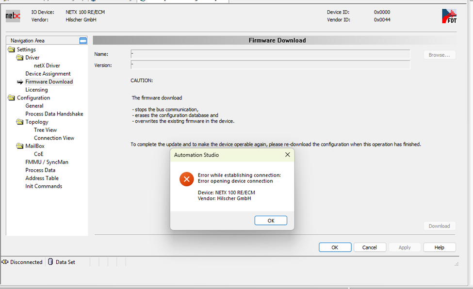 I have been trying to install the firmware update on the X20IF10G1_1 ethercat module, but I keep getting this error and I don’t know what could it be. And also the ECATRun and ECAT Err are flickering on my device.