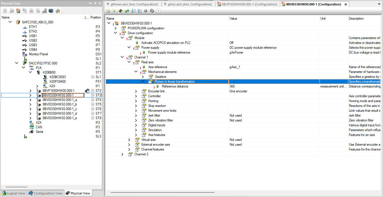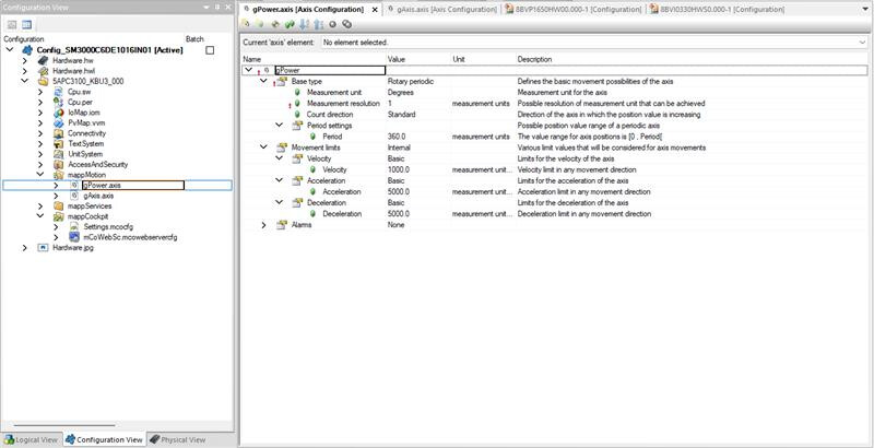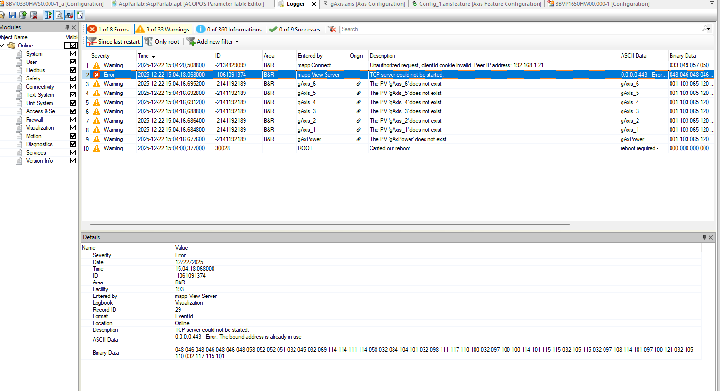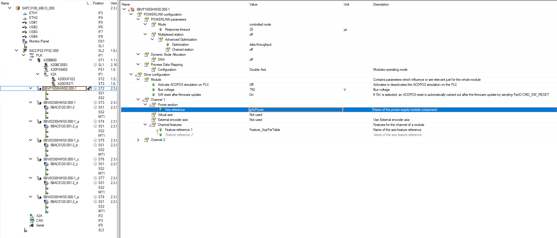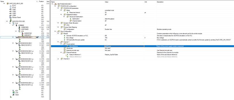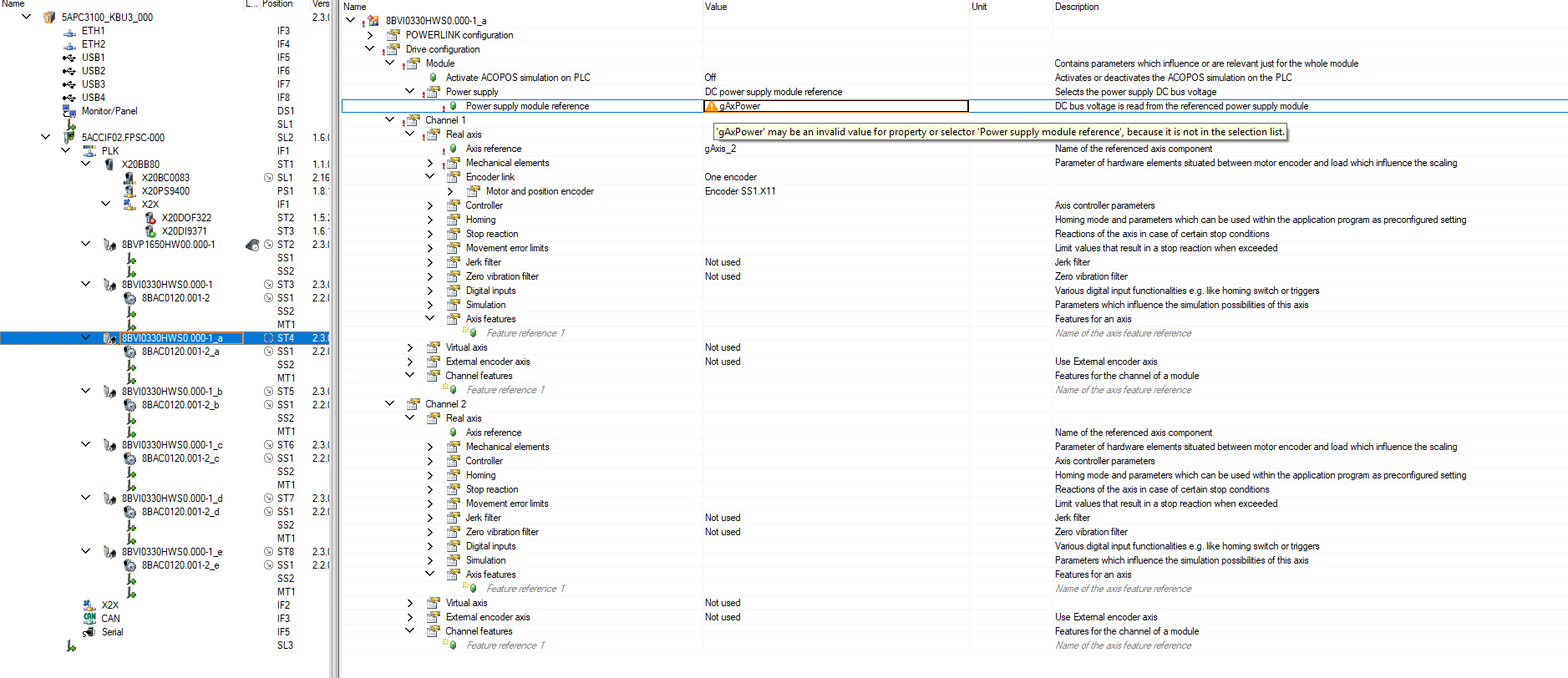 I want to use the 8BVI0330HWS0.000-1 driver with the 8VP1650HW00.000-1 module. When I set up the configuration shown in the images below and supply power to the power module via mapCockpit, I get an error.
