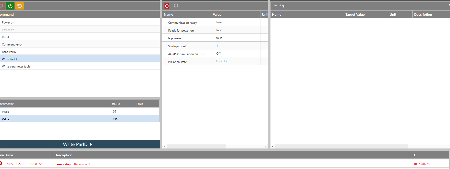 After assigning values to parameters 64, 65, and 66 via the Mapp Cockpit screen, the ready to power on variable became active for approximately 1 second and then dropped back to false. At this point, a Power Stage: Overcurrent error occurred.