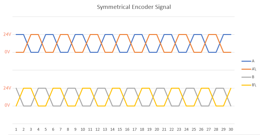 Symmetrical encoder signals evaluate the voltage difference between Signal and Signal\. If Signal is greater than Signal\, that is interpreted as a 1. If Signal\ is greater than Signal, that is interpreted as a 0.