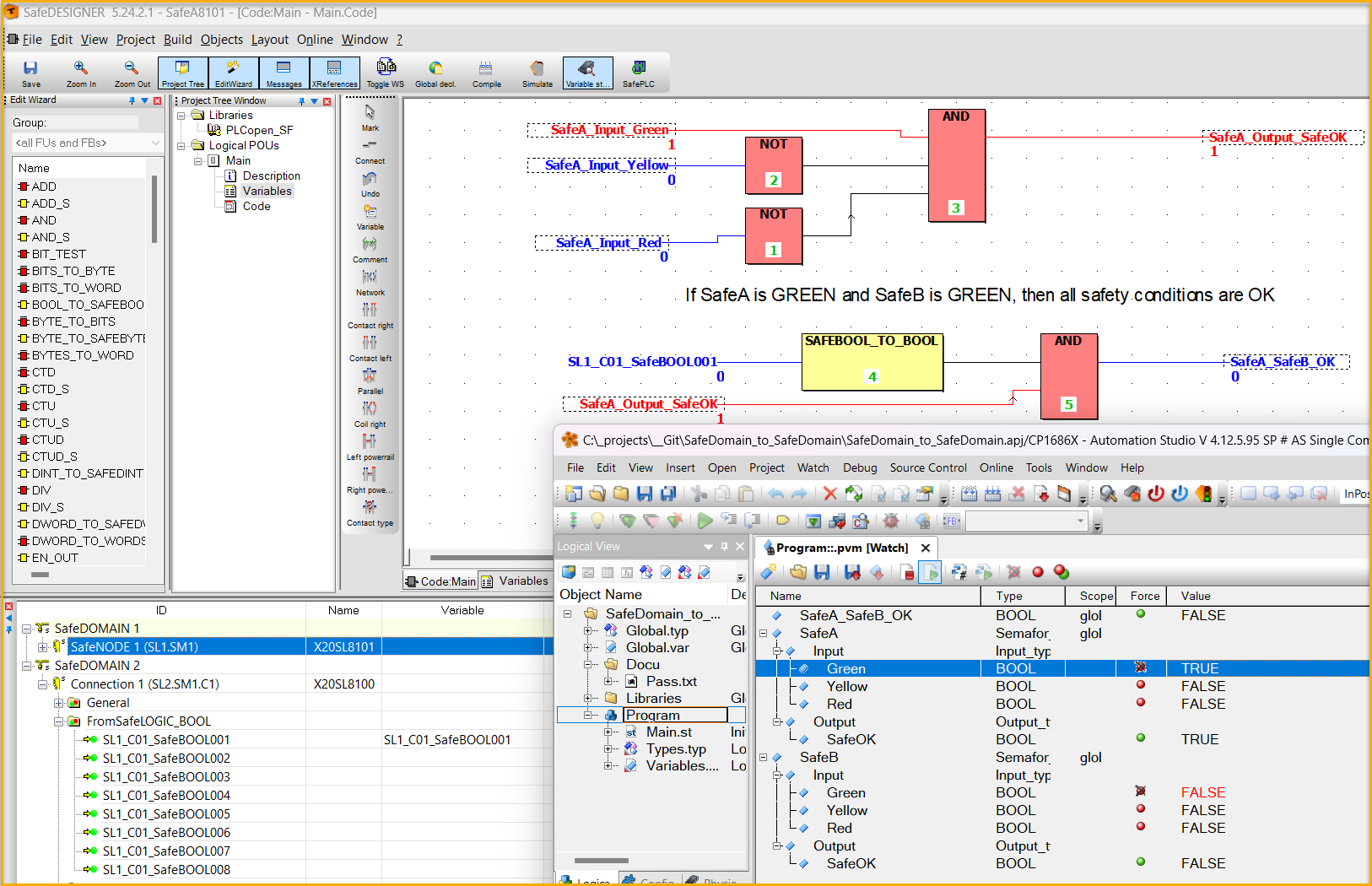 If StationA/SafeA has “GREEN” can produce, but if StationB/SafeB has RED then cannot produce, and then the entire Safety have to hold the entire machine and nothing can start. We have two part of machine, SafeA and SafeB, and the entire Safety system is only fulfilled if both SafeA and SafeB are in GREEN state.