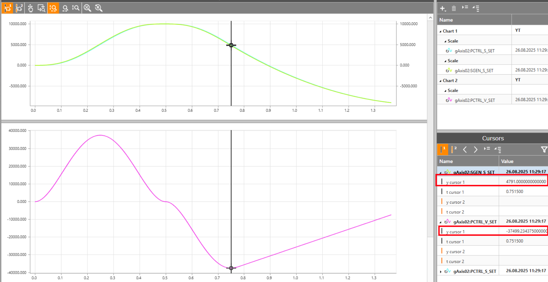 The green curve shows the position value, while the purple curve shows the velocity. The cursor is placed at the starting point of the braking parabola which gets triggered during the movement in order to not violate the negative software end limit.