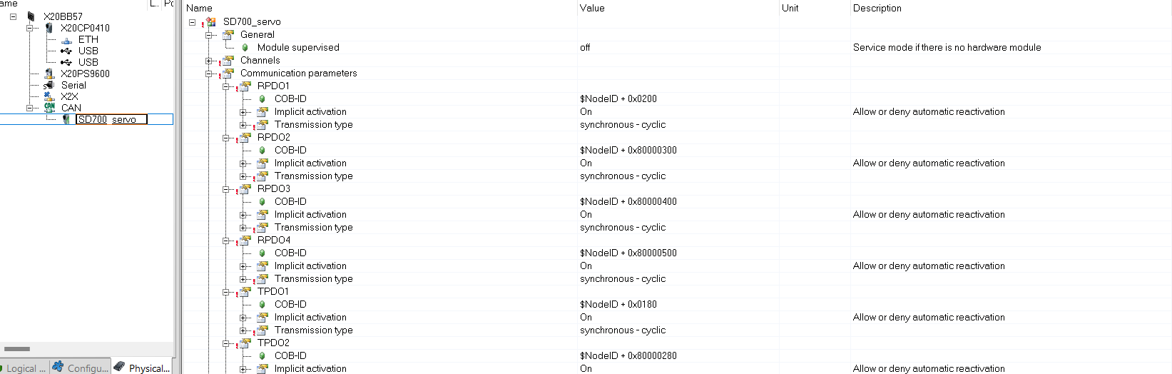 I’m using X20CP0410+BB57 to control a Servo with Canopen.The picture shows what is happening on the bus.After Master read 1000.00h(Device Type)、1018.00h(number of Entries) 、1018.01h(Vendor ID)、1018.02(Product Code)、1018.03h(Revision number).Master hadn’t configured the slave via SDO telegrams and I wonder why this not happen?