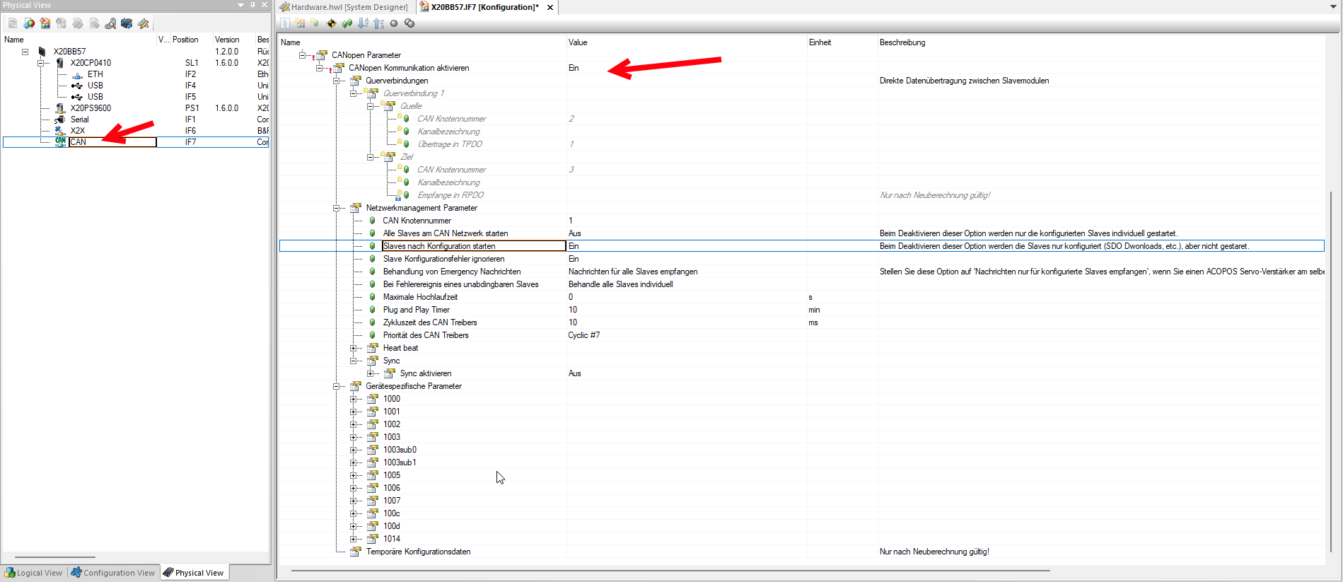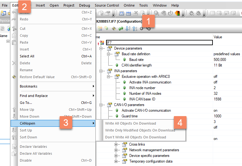 Try changing your CANopen download settings to “Write All Objects on Download.” The setting is a bit hidden, but you can reach it by opening the CAN interface configuration (1), then going to Edit (2) > CANopen (3) > Write All Objects on Download(4). Build the project and transfer to the PLC. You may need to give a warm restart to both the PLC and slave device.